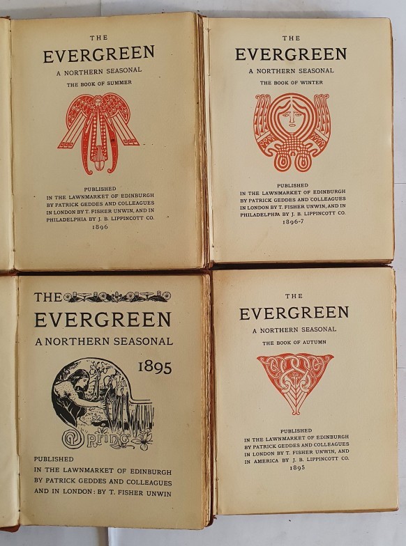 The Evergreen. A Northern Seasonal. The Book of Spring, Summer, Autumn and Winter. Published by Edinburgh: Patrick Geddes And Colleagues & London: T.Fisher Unwin 1895-97, 1895. 1st Ed. Issued in decorative coloured leather bindings with a later custom made slipcase