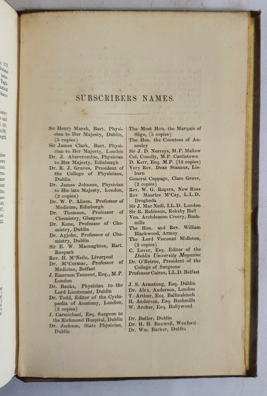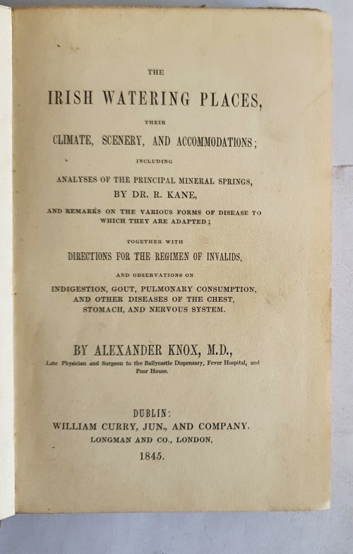 The Irish Watering Places, Their Climate, Scenery, And Accommodations; Including Analyses Of The Principal Mineral Springs, By Dr. R.Kane, And Remarks On The Various Forms Of Disease To Which They Are Adapted. KNOX, Alexander. Published by Dublin: William Curry, Jun., And Company, 1845. 8vo. pp. viii, 336. wood-engraved frontis. list of subscribers.,