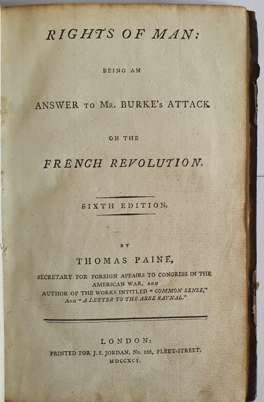 Rights of Man: being an answer to Mr. Burke's attack on the French revolution; by Thomas Paine, Printed for J. S. Jordan, 1791, Sixth edition. Some figures doodled on front end papers