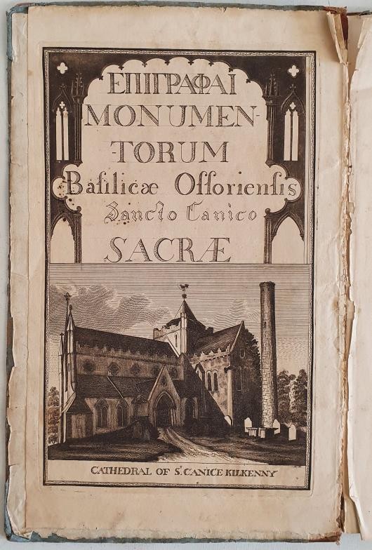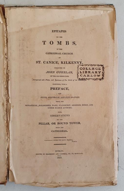 O'PHELAN, John. Epitaphs on the Tombs in the Cathedral Church of St. Canice, Kilkenny ... also Observations on the Pillar, or Round Tower, near the Cathedral, edited by Peter Shee. Dublin: Graisberry and Campbell, 1813, 10 plates, frontispiece. Disbound