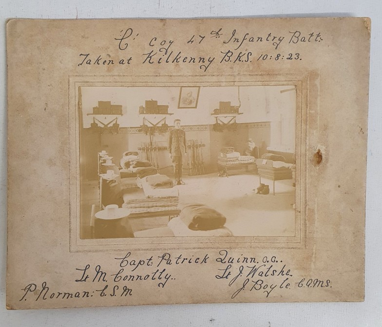 Photograph taken at Kilkenny Barracks 1923. The dorm accommodated Captain Patrick Quinn and four others listed. Photo shows image belived to be of Captain Quinn-who became one of Eoin O’Duffy’s most loyal captains, as part of the Kilkenny Blueshirt Division. In 1937, Padraig Quinn was part of a brigade that left Ireland for Spain to fight alongside General Franco’s men. 6" x 4.5"