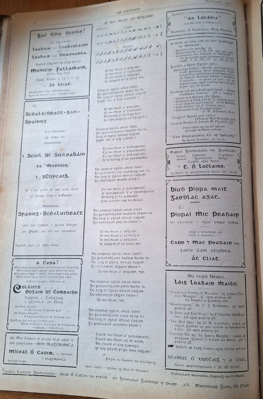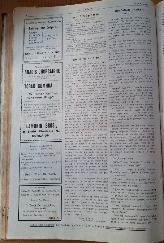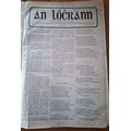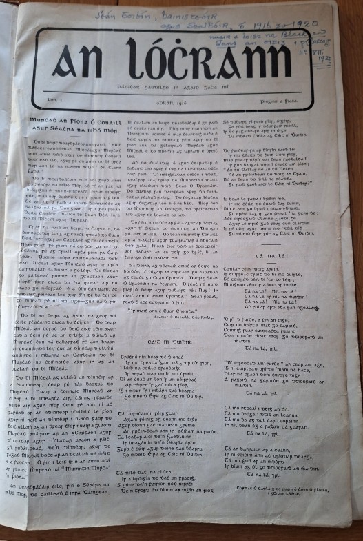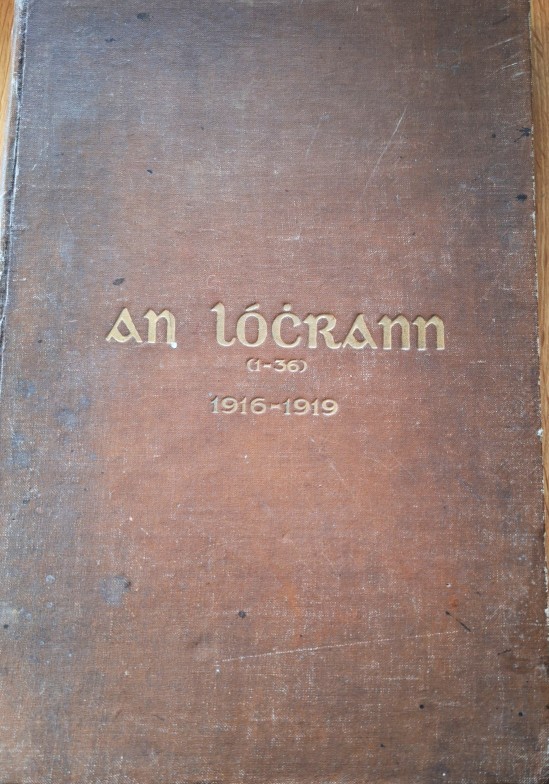 Cork Irish Language Newspaper: An Lóchrann 1916-1919, Issues 1 – 36. Bound volume of Shandon Press monthly Irish Language publication. Interesting advertisements by local Cork businesses. Inscription to front page of No. 1, April 1916: ‘Seán Toibín, bainisteoir agus sealbhóir ó 1916 to 1920, nuair a loisc n Black and Tans an oifig i gCorcaigh, 11/12/1920.’ [Sean Tobin, manager and owner from 1916 to 1920, when the Black and Tans torched the office in Cork, 11/12/20].