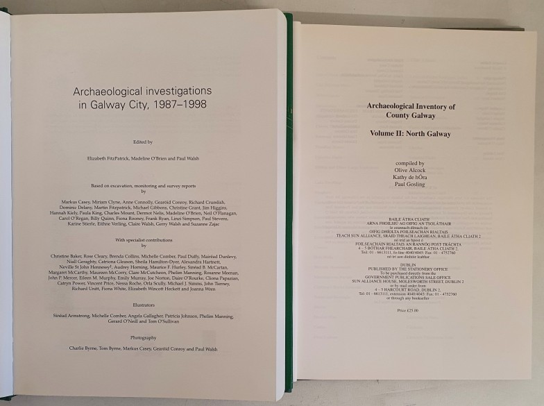 Archaeological Investigations in Galway City: 1987-1998. Fitzpatrick, O’Brien, Walsh. Wordwell. 1987 and Archaeological Inventory of County Galway. North Galway.2 large format volumes both in djs