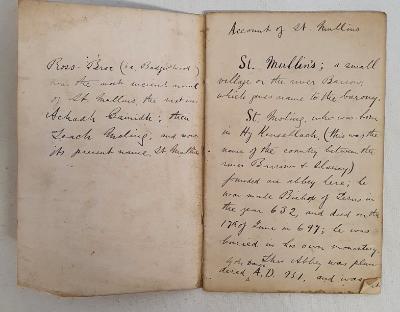 Manuscript description of St Mullins ( St Mullins is a village, civil parish and townland on the eastern bank of the River Barrow in the south of County Carlow), dated 1880, 10pp and initialed P O'L-one of the O'Leary Historians from Graignamanagh, Co Kilkenny