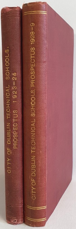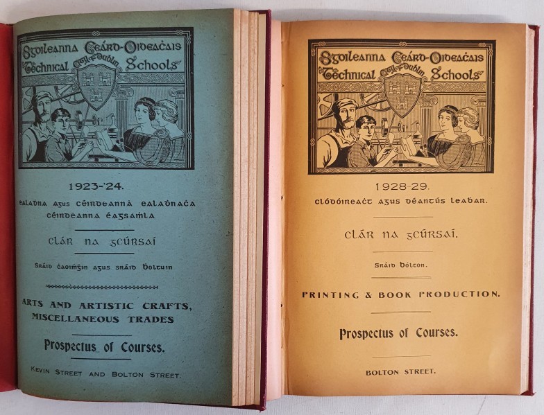 Bolton Street Prospectus for 1923-24 & 1928-29. Scarce and original wrappers present, artwork by Leo Whelan. Titles in Irish and English. Bound in two Volumes, 1923.24, volume containing prospectus for “Printing and Book Production”, “School of Music”, “Commerce”, Domestic Science”, “Arts and Artistic Crafts, Miscellaneous Trades”, “Architecture and Building”, “Electrical Engineering, Chemistry”. 1928.29, volume containing prospectus for “Mechanica Engineering”, “Architecture, Building and Furniture Trades”, “Printing and Book Production”,” Electrical Engineering, Wireless Telegraphy, Applied Chemistry and Pharmacy”, “Commerce”, “Domestic Science”, “Arts and Artistic Crafts, Miscellaneous Trades”, “Municipal School of Music”.l