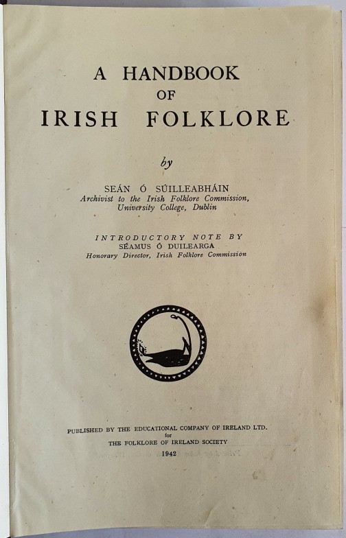 A Handbook of Irish Folklore Seán Ó Súilleabháin Published by Educational Company of Ireland for The Folklore of Ireland Society, Baile Atha Cliath, (Dublin), 1942. 1st Edition Contemporary binding