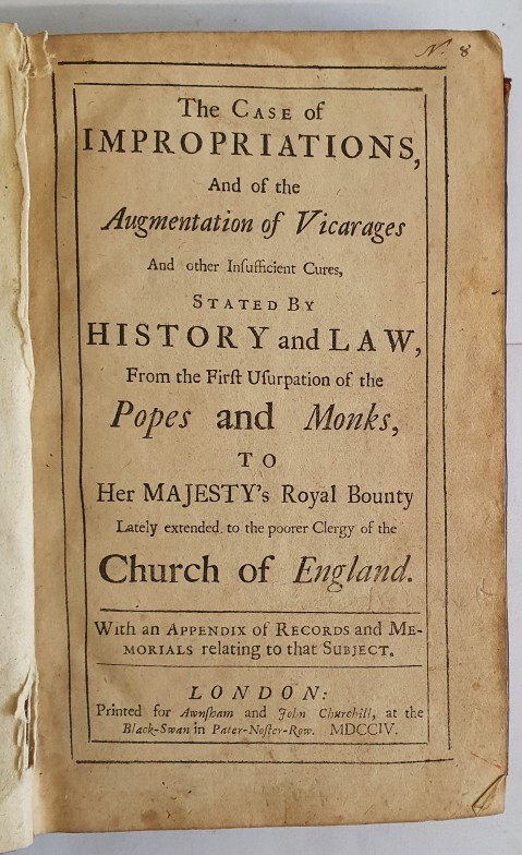 The Case of Impropriations and of the Augmentation of Vicarages and Other Insufficient Cures, Stated by History and Law, from the First Usurpation of the Popes and Monks, to Her Majesty's Royal Bounty, Lately Extended to the Poorer Clergy of the Church of England, 1704. A very scarce first edition of White Kennett's interesting analysis of the Church of England, written just after a period of serious religious turmoil in England. Full leather