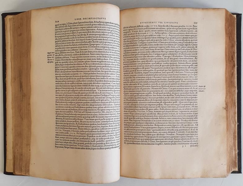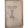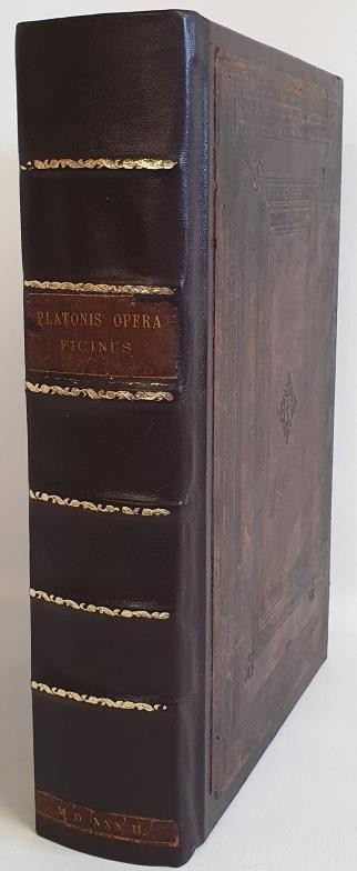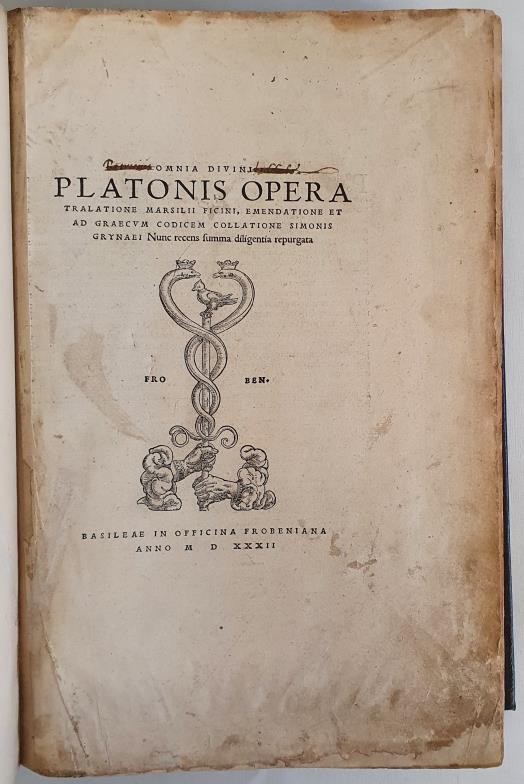 Omnia Divini Platonis Opera Tralatione Marsilii Ficini, Emendatione Et Ad Graecum Codicem Collatione Simonis Grynaei Nunc Recens Fumma Diligentia Repurgata. This edition translated by Marsilio Ficino and edited and collated with Greek manuscripts by Simon Grynaeus. Printer's mark for the Froben Press with a caduceus-like staff entwined with two serpents, held by two hands emerging from clouds. Printed: Basilae, MDXXXII (Basel, 1532). Part original front and rear board, otherwise rebound in full calf. Large quarto. Original title label and date label on spine with six raised bands.