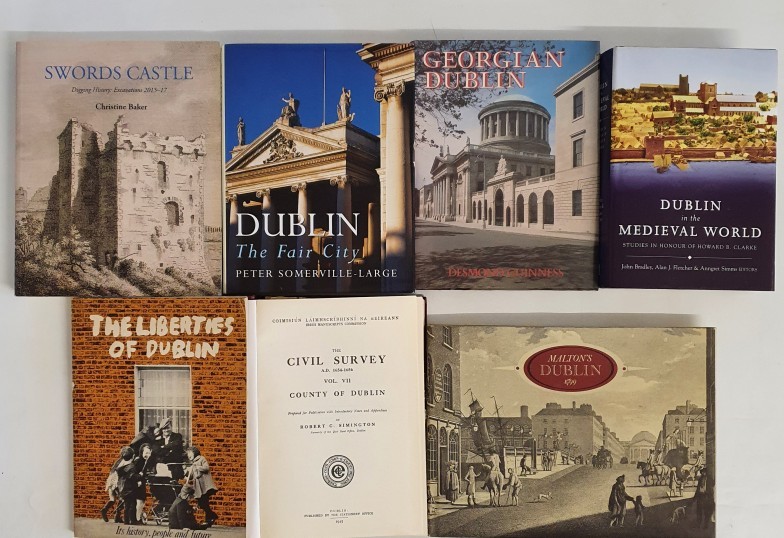 Dublin: Swords Castle- Digging History: Excavations 2015-17 by Christine Baker, 2022; Dublin in the Medieval World edited by Bradley/Fletcher and Simms, 2009; Georgian Dublin by Desmond Guinness SIGNED, 1979 plus 4 others (7)