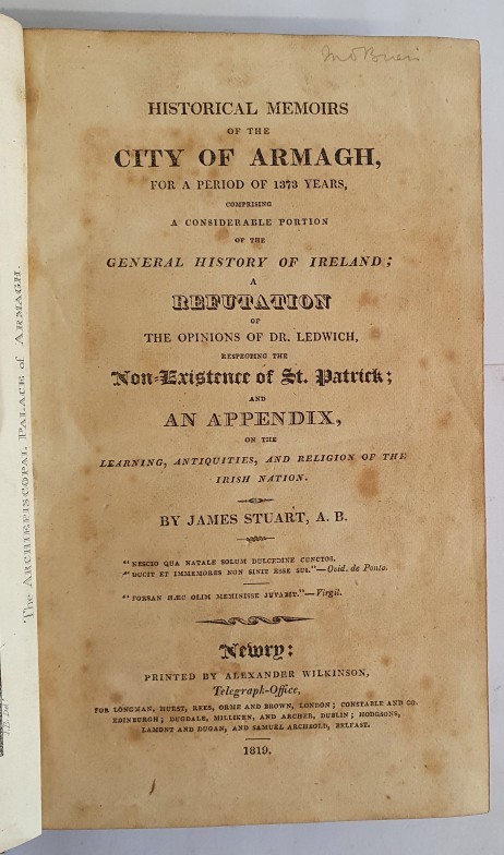 Historical Memoirs of the City of Armagh, for a Period of 1373 Years Stuart, James Published by Longman, Hurst, Rees, Orme and Brown, Newry, 1819, Half calf, Marble Boards;