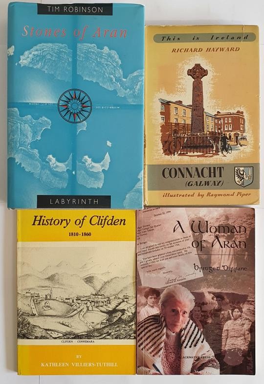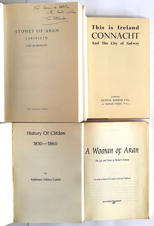 Tim Robinson – Stones of Aran, published by Lilliput Press, 1995. True first not the revised edition. Signed and Inscribed by the author to the title page. [ For Sean and Shiela with best wishes, Tin Robinson] Kathleen Villiers-Tuthill - History of Clifden 1810-1860, published 1981. (Map present to rear) Bridget Dirrane - A Woman of Aran, published by the Blackwater Press 1997. Richard Hayward - Connacht (Galway), in original jacket, published 1952. (4)