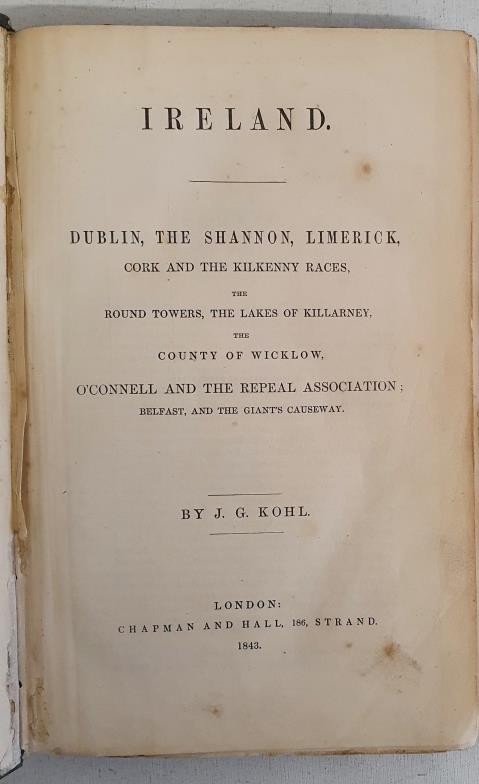 Ireland. Dublin, the Shannon, Limerick, Cork and Kilkenny Races, Round Towers, Lakes of Killarney, Wicklow, O'Connell and Repeal Association; Belfast, Giant's Causeway. Johann George Kohl. 1843. Pre-famine tour book in original binding