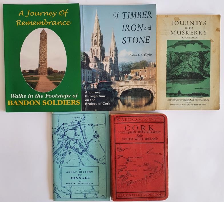 (Cork Interest) A Journey of Remembrance Walks in the footsteps of Bandon Soldiers. Published 2005. J.C. Coleman – Journeys Into Muskerry, published by The Dundalgan Pess, 1950. Antóin O'Callaghan - Of Timber Iron and Stone - A Journey Through Time on the Bridges of Cork, published 1991. Michael Mulcahy - Short History of Kinsale, (all maps present) published 1965. Ward Lock Cork Guide, with maps present. (5)