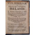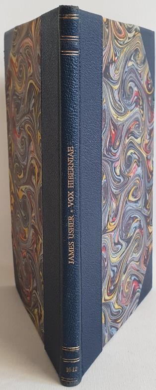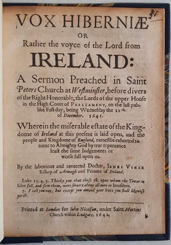 USHER, James. Vox Hiberniae or Rather the voyce of the Lord from Ireland: A Sermon Preached in Saint Peters Church at Westminster, before divers of the Right Honorable, the Lords of the upper House in the High Court of Parliament, on the last publike Fast day, being Wednesday the 22th of December. 1641. Wherein the miserable estate of the Kingdome of Ireland at this present is laid open, and the people and Kingdome of England, earnestlie exhorted to turne to Almighty God by true repentance least the same Judgements or worse fall upon us. By the laborious and reverend Doctor, James Ussher Bishop of Armagh and Primate of Ireland. London: Printed at London for John Nicolson, under Saint Martin's Church within Ludgate, 1642. Small quarto. pp. [16]. Half blue goatskin on marbled boards. Rare.
