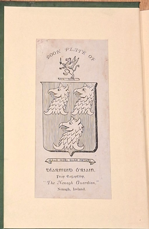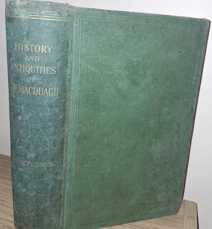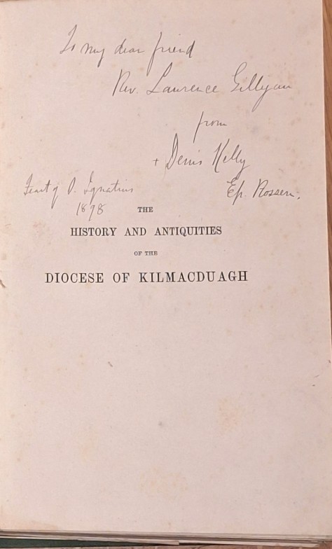 History and Antiquities of Kilmacduagh. (J. Fahey DD, VG, 1893) Staining to boards/spine. Later endpapers. Book Plate of Diarmuid Ó Riain, Editor ‘The Nenagh Guardian’. Interesting inscription to half-title: ‘To my dear friend Rev Laurence Gilligan from + Denis Kelly, Ep. Rossen, Feast of St Ignatius, 1898.’ Denis Kelly (1852-1924) was Bishop of Ross 1897-1924. Seven illustrations called for – all present