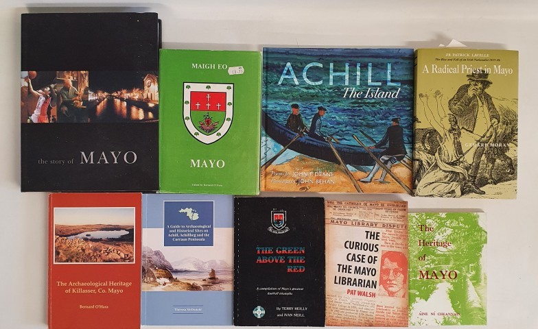 Mayo: The Story of Mayo by Rosa Meehan, 2003; Mayo-Aspects of Its Heritage edited by Bernard O'Hara, 1982; Achill-The Island, Poems by John F Deane, Paintings by John Behan, 2018; The Green Above The Red- compilation of Mayo's greatest football triumphs by Terrry reilly and Ivan Neill, 1985 plus 5 others (9)
