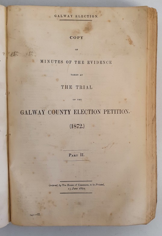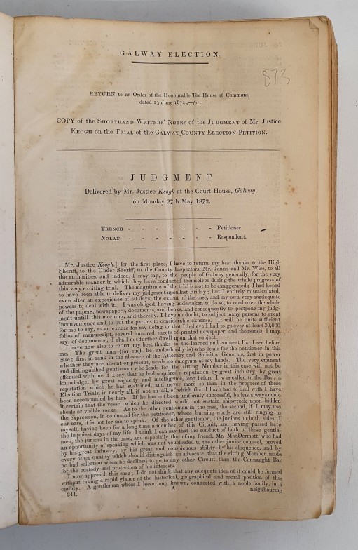 Official Transcript of the Judgement delivered by Mr Justice Keogh on May 27th 1872 regarding the Galway County Election Petition. Involving the petitioner Trench and the respondent Nolan. pp 873. Boards /spine replaced