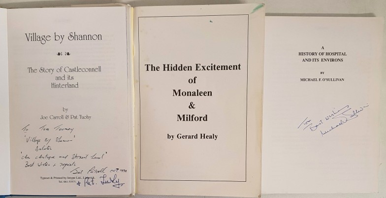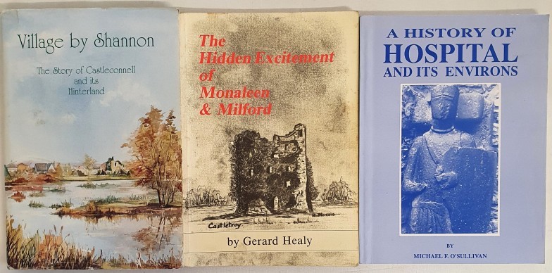 Village by Shannon. Story of Castleconnell and its Hinterland. 1991. Presentation copy from authors. Dj; Monaleen & Milford by Healy. Signed and History of Hospital by O’Sullivan. 1995. Signed. 3 scarce Limerick parish histories