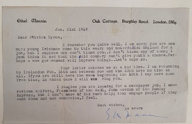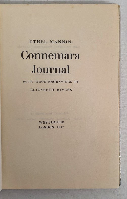 Ethel Mannin. Connemara Journal. 1947. 1st Illustrated by Elizabeth Rivers. Inscribed letter from author to Patrick Byrne, an Irish journalist seeking work. Ethel Mannin a proponent of free love had numerous lovers including W.B. Yeats. Pictorial d.j. with River's illustration. . Scarce with letter