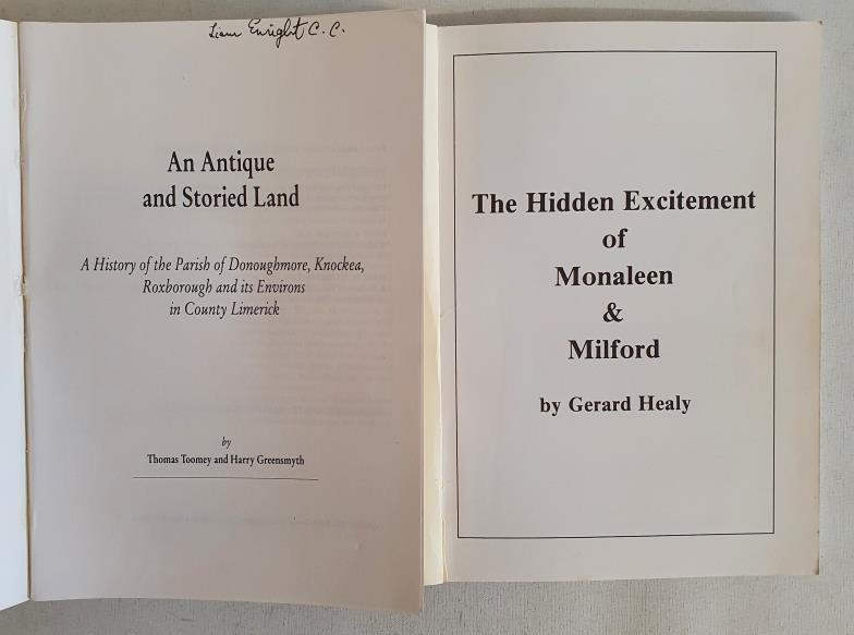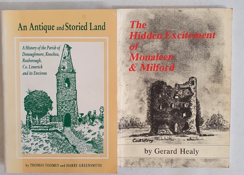 An antique and storied land: history of Parish of Donoughmore, Knockea, Roxborough and environs in County Limerick by Toomey and Greensmyth. 1991 and Hidden Excitement of Monaleen & Milford. 2 books