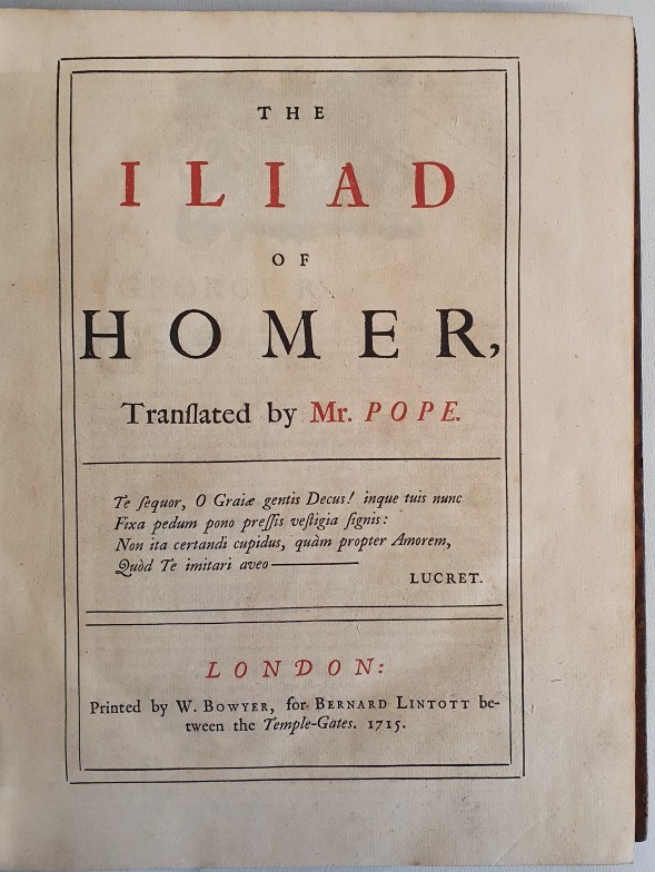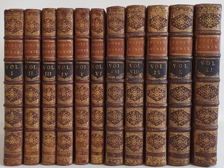 The Odyssey of Homer; The Iliad of Homer Homer (Alexander Pope, translator). Printed for Bernard Lintot, 1715/1726. 11 Volumes uniformly bound in contemporary full calf with gilt lettering and decoration. 4to. Book plate of Sir Henry Echlin Bart Irish barrister, judge, and bibliophile Of the Echlin Baronets of Clonagh, County Kildare.
