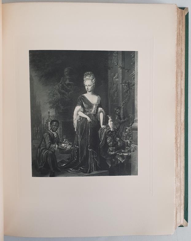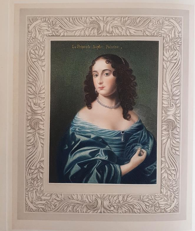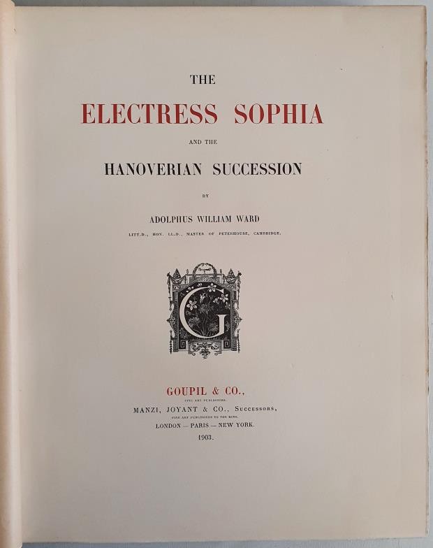 Ward, Adolphus William, Sir. The Electress Sophia and the Hanoverian Succession. Goupil & Co. 1903. Limited edition of 1,000, this being 949. large 4to, pp. [4], v, [1], 254, [1]; gorgeous color frontis portrait of Sophia, gravure plates and illus. in the text throughout. Quarter calf and cloth boards, gilt titles on spine with five raised bands.
