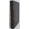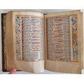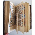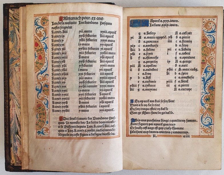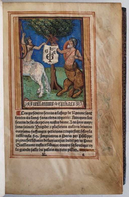 The title page with the emblem of Guillaume Eustace, and a medieval-style brightly coloured illumination depicting two centaur-like figures interacting with a tree, holding a banner and surrounded by a gilt border. Almanac. Profusely hand decorated with borders of flowers and geometric patterns, title page image, one full page illumination, one medium and eight smaller ones. Full calf binding, 12mo. pp198, with some portions lacking - 2 right hand page borders, 2 half page illimunations (plus text on obverse) and 2 small illuminations (plus text on obverse).