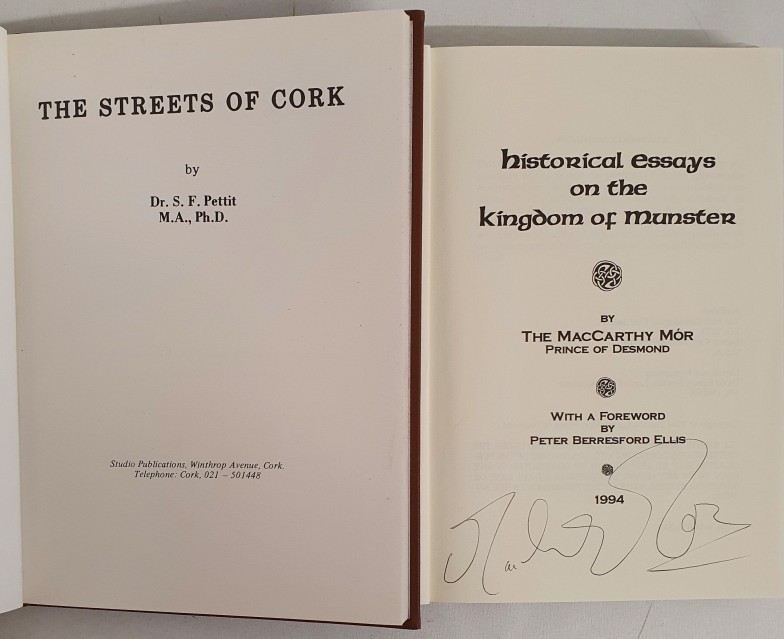The Streets of Cork by Sean Pettit. 1982 and Historical Essays on the Kingdom of Munster by the MacCarthy Mor. 1984 signed by the author. 2 hardbacks.