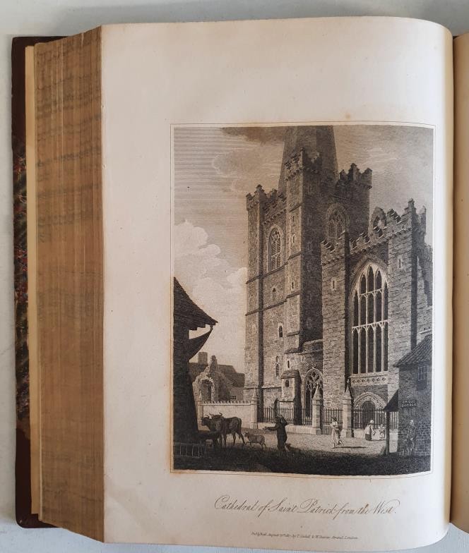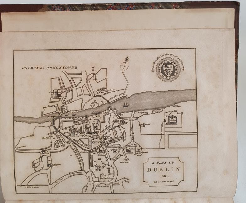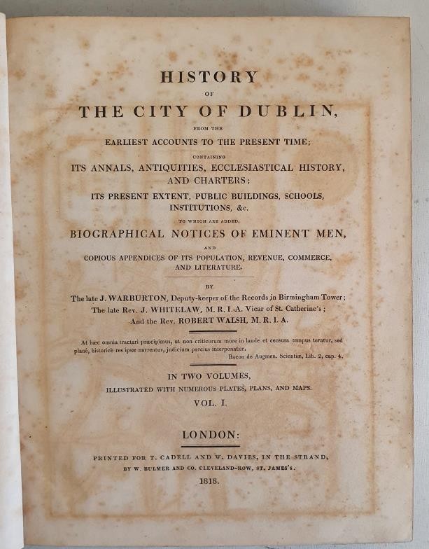 Dublin] Warburton, Whitelaw & Walsh History of the City of Dublin, 1818, 2 vols. quarto, with engraved plates & maps (some large folding) Half Calf, Marble Boards, 5 raised bands, gilt lettering on spine