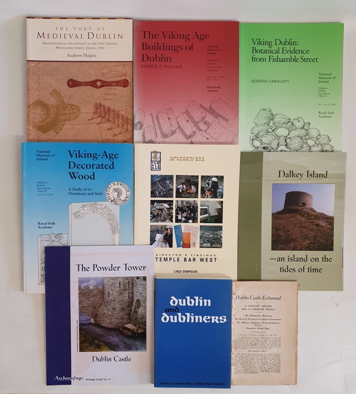 Dublin: Dublin Castle Exhumed : a Unionist regime and a coercion policy. July, 1916. A very rare publication written a few months after the Easter Rising with understandably the Place of publication and the publisher not identified. Disbound; The Viking Age Buildings of Dublin by Patrick F Wallace, 1992; Viking Dublin: Botantical Evidence from Fishamble Street by Siobhán Geraghty, 1996; The Port of Medieval Dublin by Andrew Halpin, 2000 plus 5 others (9)