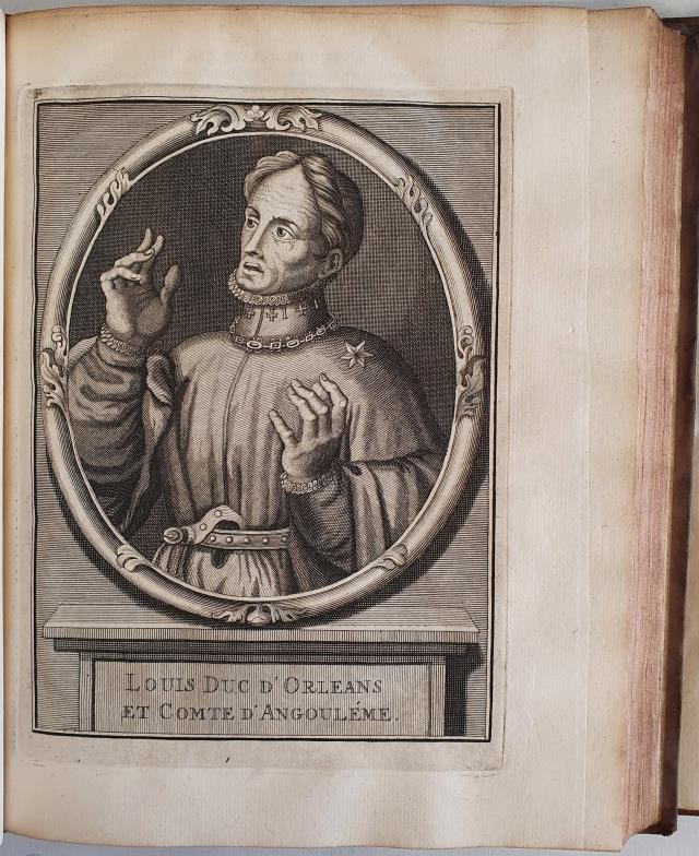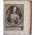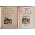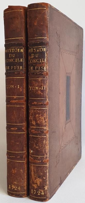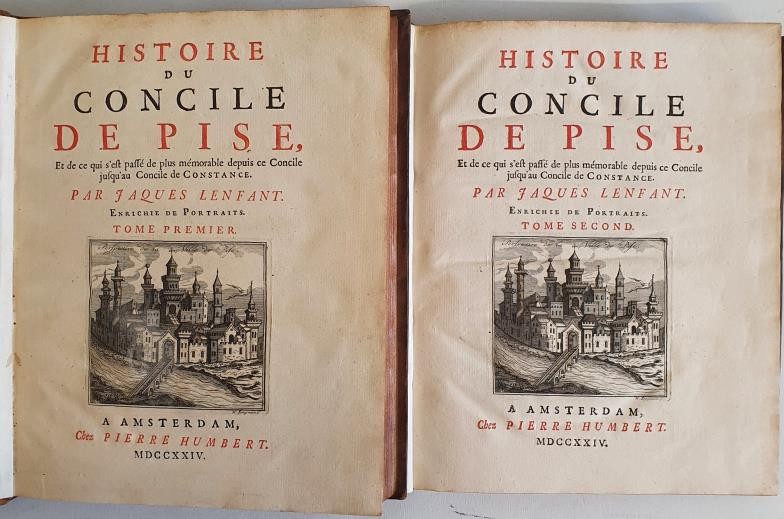 Histoire Du Concile De Pise (The History Of The Council Of Pisa) by Jacques Lenfant. Enriched with Portraits. Amsterdam: Chez Pierre Humbert. MDCCXXIV (1724). Two volumes, complete, title pages with red and black text and woodcut vignette "perspective of the city of Pisa". Large octavo, full calf with decorations, labels to spines with gilt titles and five raised bands. First edition containing 15 full page portraits plus Medal plate (2)