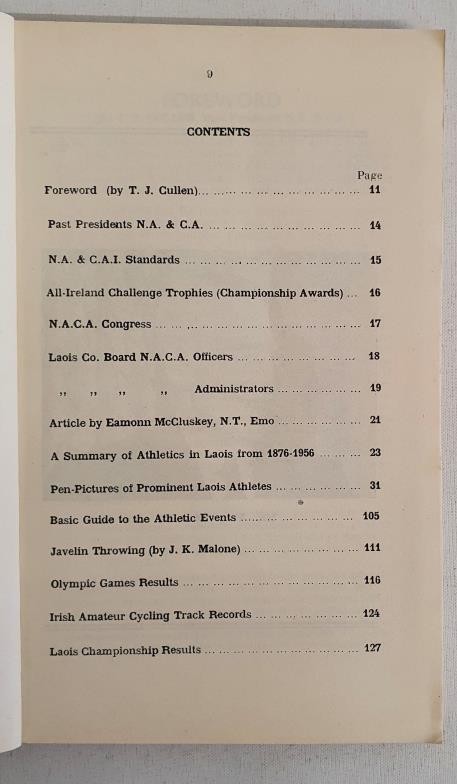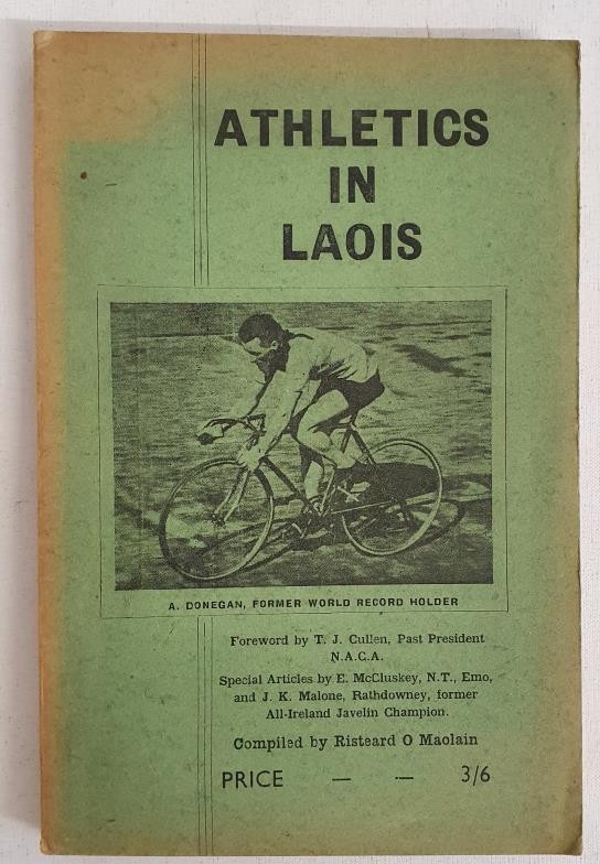 Laois: Athletics in Laois compiled by Risteard O Maolain, 1956. Green soft cover with an image of A Donegan, cyclist, former world record holder on cover. Octavo. Fine condition