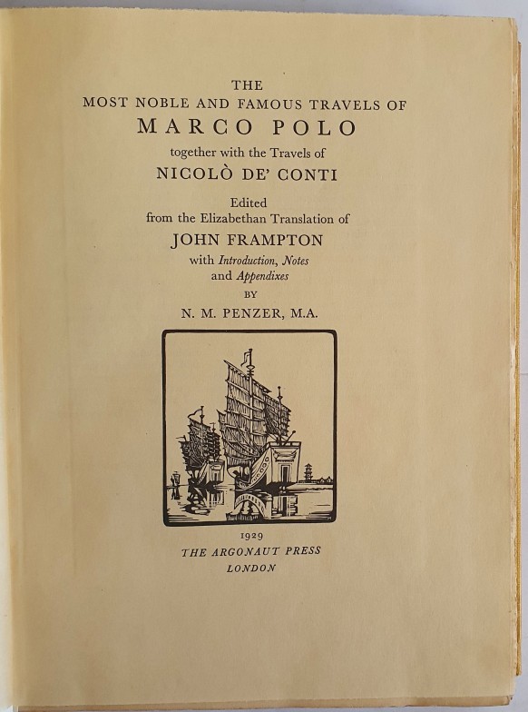 N. M. Penzer. The Most Noble and Familiar Travels of Marco Polo. 1929.Coloured frontispiece. Maps. Quarter vellum