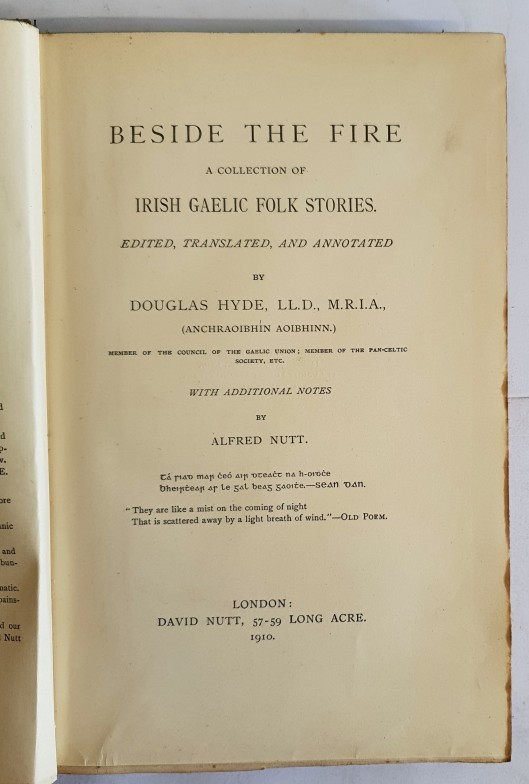 Beside The Fire - A Collection of Irish Gaelic Folk Stories Hyde, Douglas. L.L.D. Published by David Nutt, Londdon, 1910. Original green cloth, gilt title on spine. Scarce.