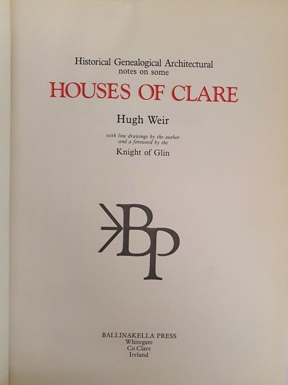 Historical genealogical architectural notes on some houses of Clare Hugh W. L. Weir. Ballinakella Press. 1986. First edition. Large format in dj. An account of over 700 landed gentry houses in Clare