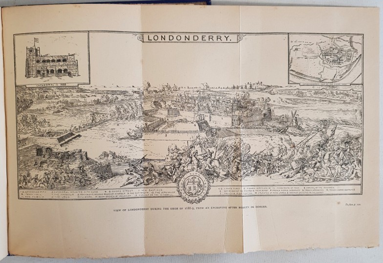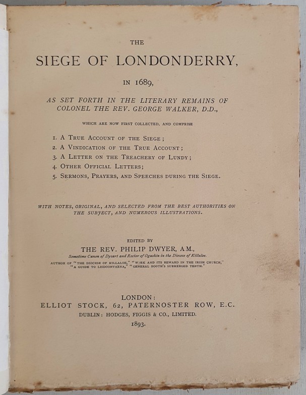 THE SIEGE OF LONDONDERRY, In 1689 As set forth in the Literary Remains of Colonel the Rev. George Walker,D.D., DWYER, Rev Philip M.A: Published by LONDON; Elliot Stock 62 Paternoster Row DUBLIN Hodges Figgis & Co Ltd, 1893, with a fold out map of Derry in 1689 by Francis Neville. 1st Ed. Bookplate of R B A Ruth
